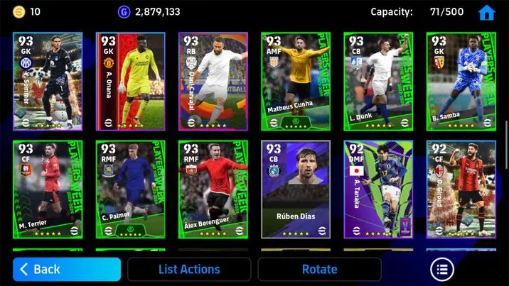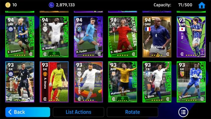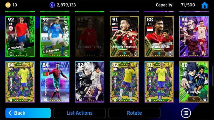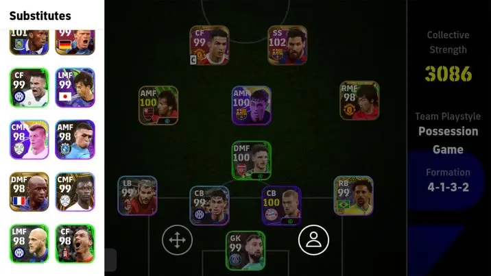 3086 Strength/BEST DUO(Cristiano Ronaldo,Lionel Messi)-Legendary(Cristiano Ronaldo,Lionel Messi,Didier Drogba,Oliver Kahn,Vieira,Fernando Torres)-Epic(Zico,Park Ji-Sung,Neymar Jr,Joshua Kimmich,Chanathip,Arhan, Takefusa Kubo,Filippo Inzaghi)-POTW(De Ligt,Lautaro Martinez,Phil Foden,Donnarumma,Dimarco,Darwin Nunez,Declan Rice,Bastoni,Rudiger,Cunnha,Dunk,Samba,Palmer,...)-Highlight(Pedri,Bastoni,Theo,Griezman,Toni Kroos,Camavinga,Mitoma,Marquinhos,Rice,Onana,Carvajal,....)
