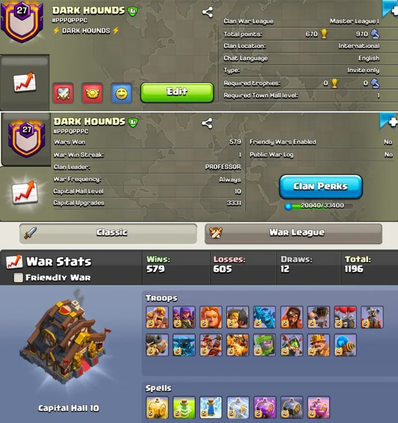 Discover this premium Clash of Clans account at Level 27, proudly named Dark Hounds. Featuring a Master League 1 status with an impressive Lil Negative War Log, this base includes a maxed Clan Castle (CC) at 10 troops. Enjoy unbeatable value at a cheap price, with instant delivery for immediate access to your new gaming adventure.