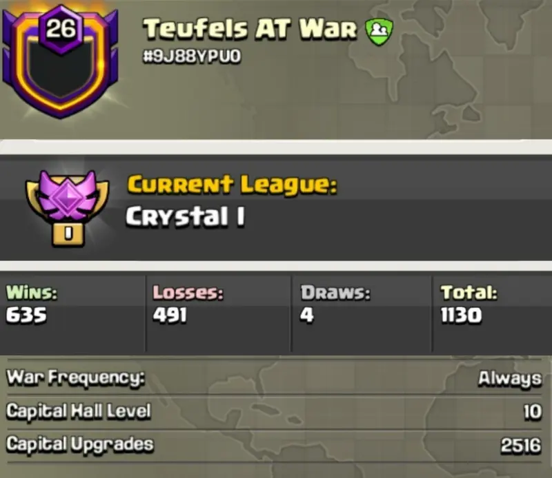 GERMAN CLAN 💎 NAME: Teufels AT War 💎 LEVEL: 26 [] CAPITAL HALL: 10 [] WAR LOG: 635-491 [] CWL League: Crystal I