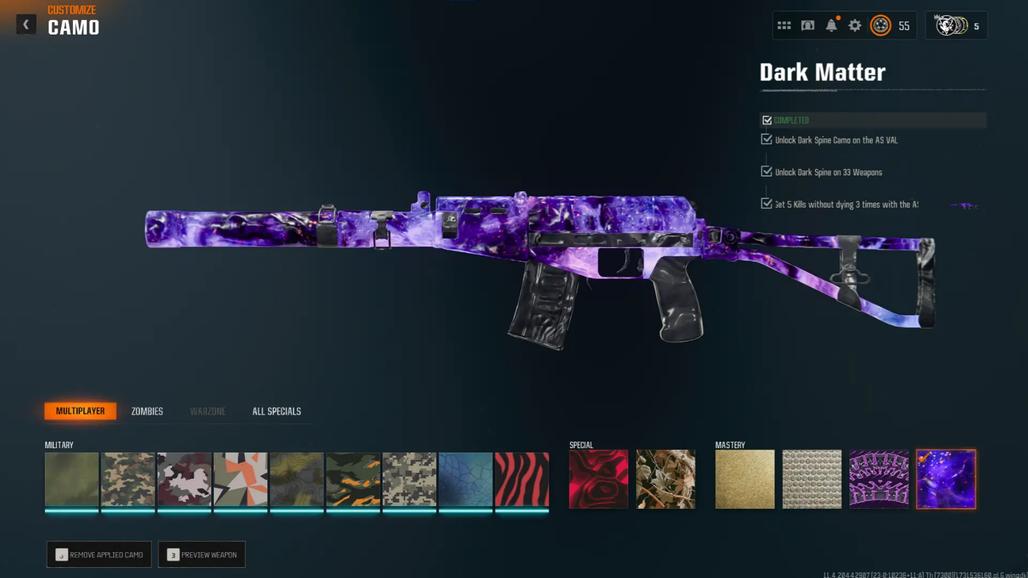 All Platforms | 33x Dark Matter - Dark Spine Camos Unlocked | Level 55 | RankedReady | BO6-WZ4 | Instant Delivery |
