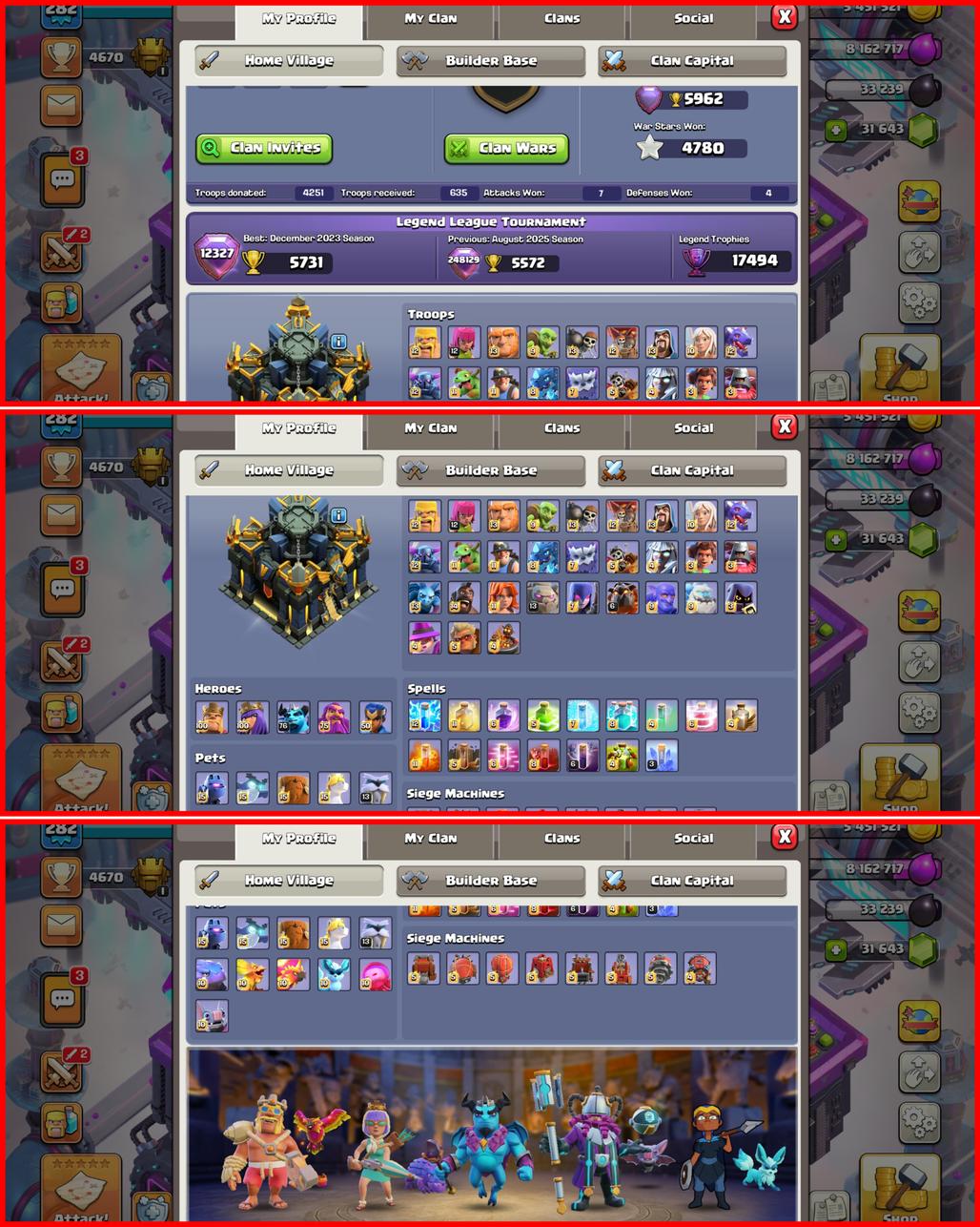 Full Max Th 17 | Ready For Th 18 | 32000 Gems | 1800 Medels | Magic Items full | 30 Skins | 3 Paid Sceanrys | Almost 8 E