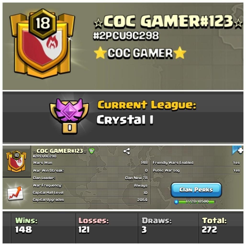 Level 18 clan || clan capital 10 || crystal 1 || warlog 148-121 || name - COC GAMER123