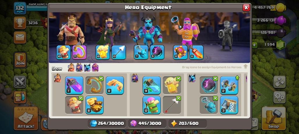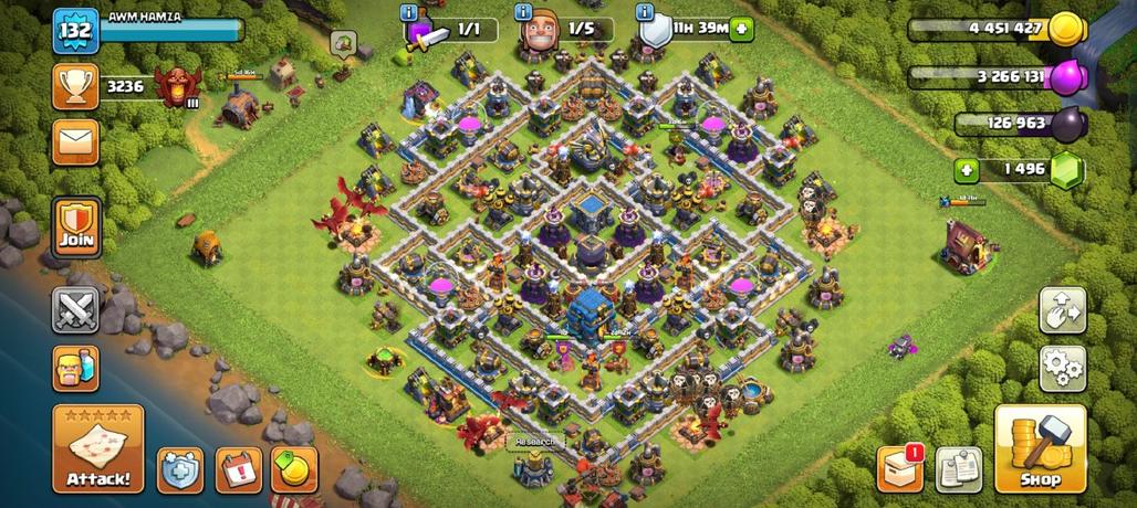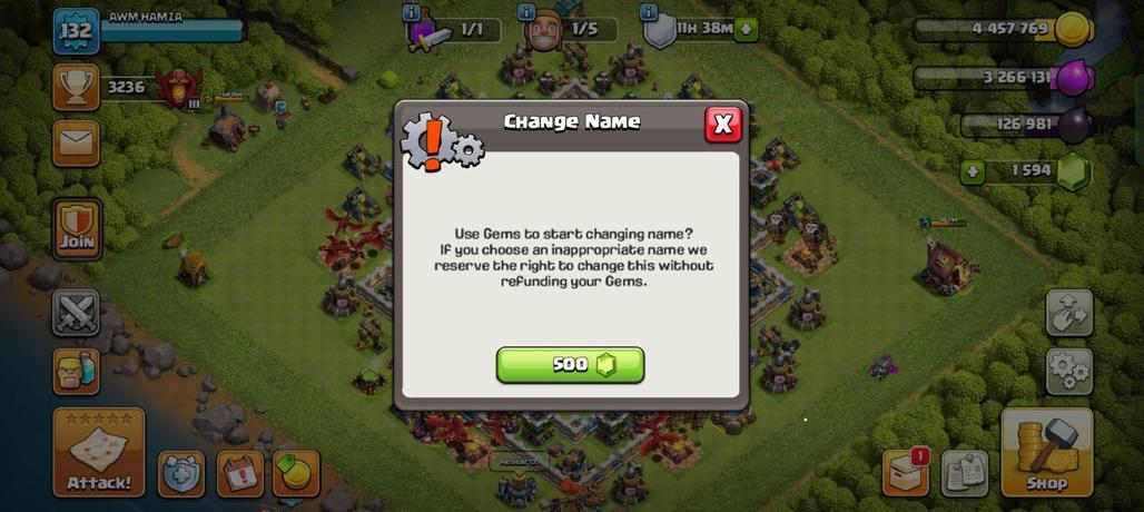 TROPHY BASE TOWNHALL 12 ⚡54-56-37-32 HEROES [] 1496 GEMS [] SNAKE PUPPET [] 132 XP [] RENAME 500 [] AVAILABLE